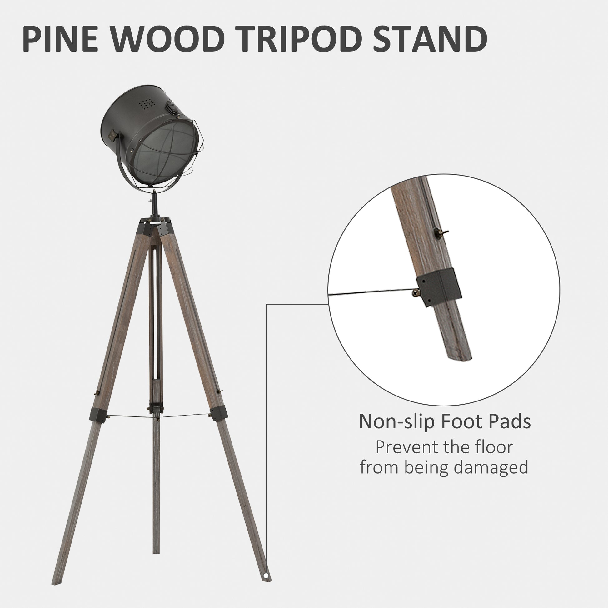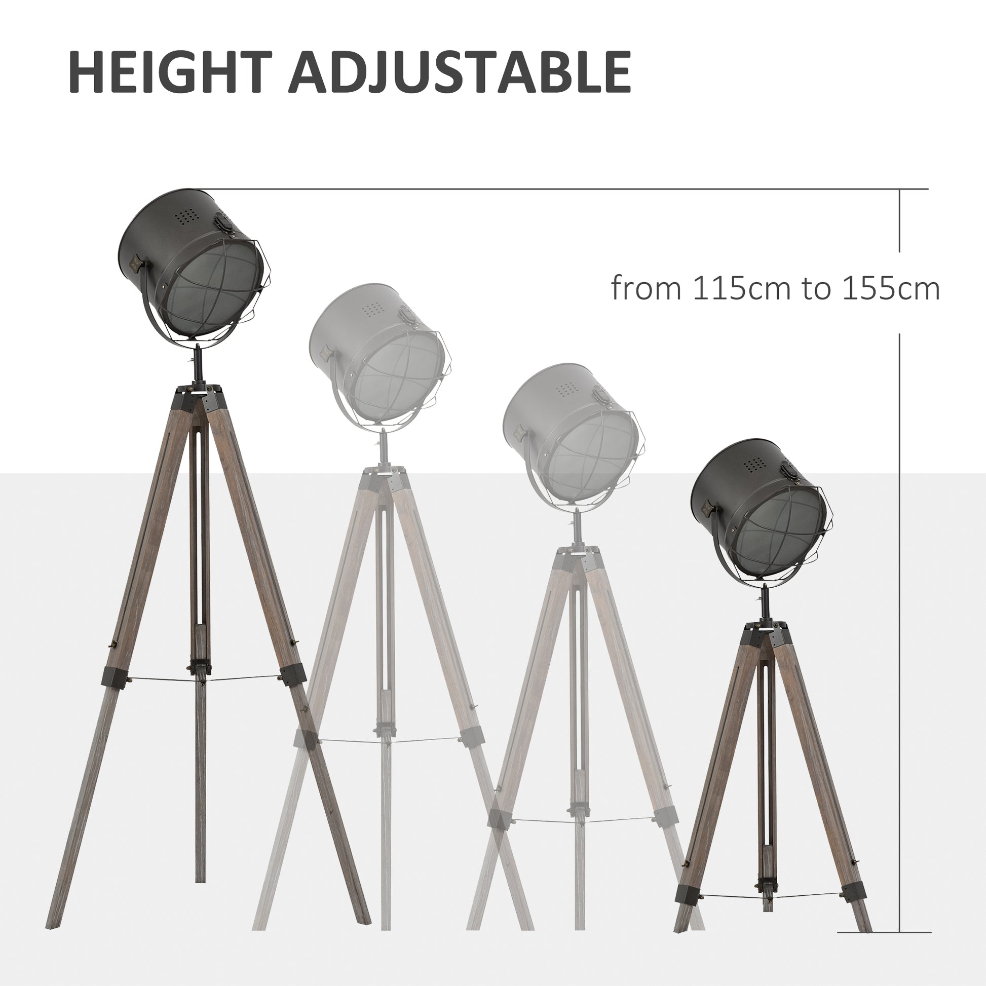 Floor Lamp with Adjustable Tripod for Living Room Bedroom, Vintage Spotlight Reading Lamp with Wood Legs, 115-155cm, Grey